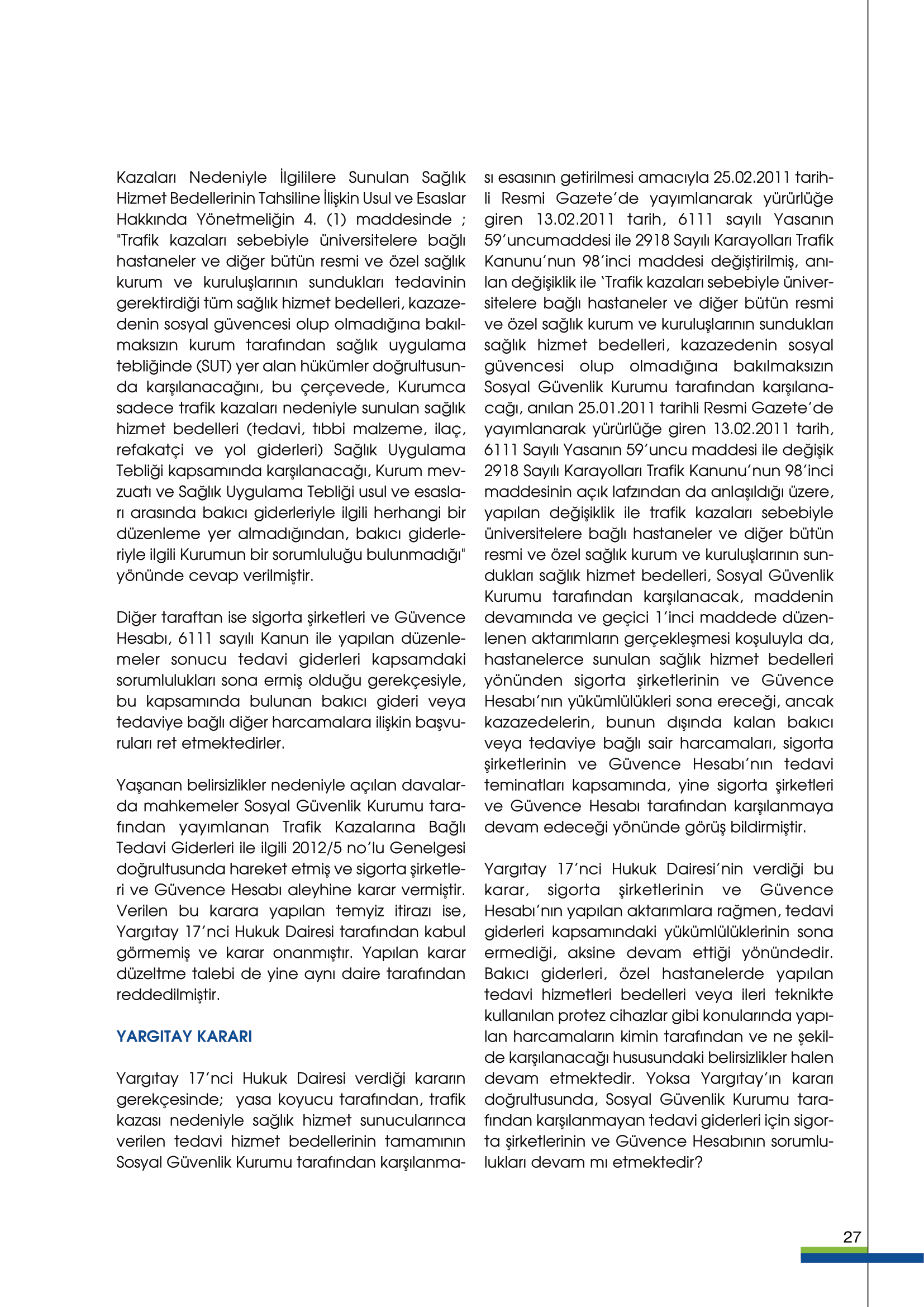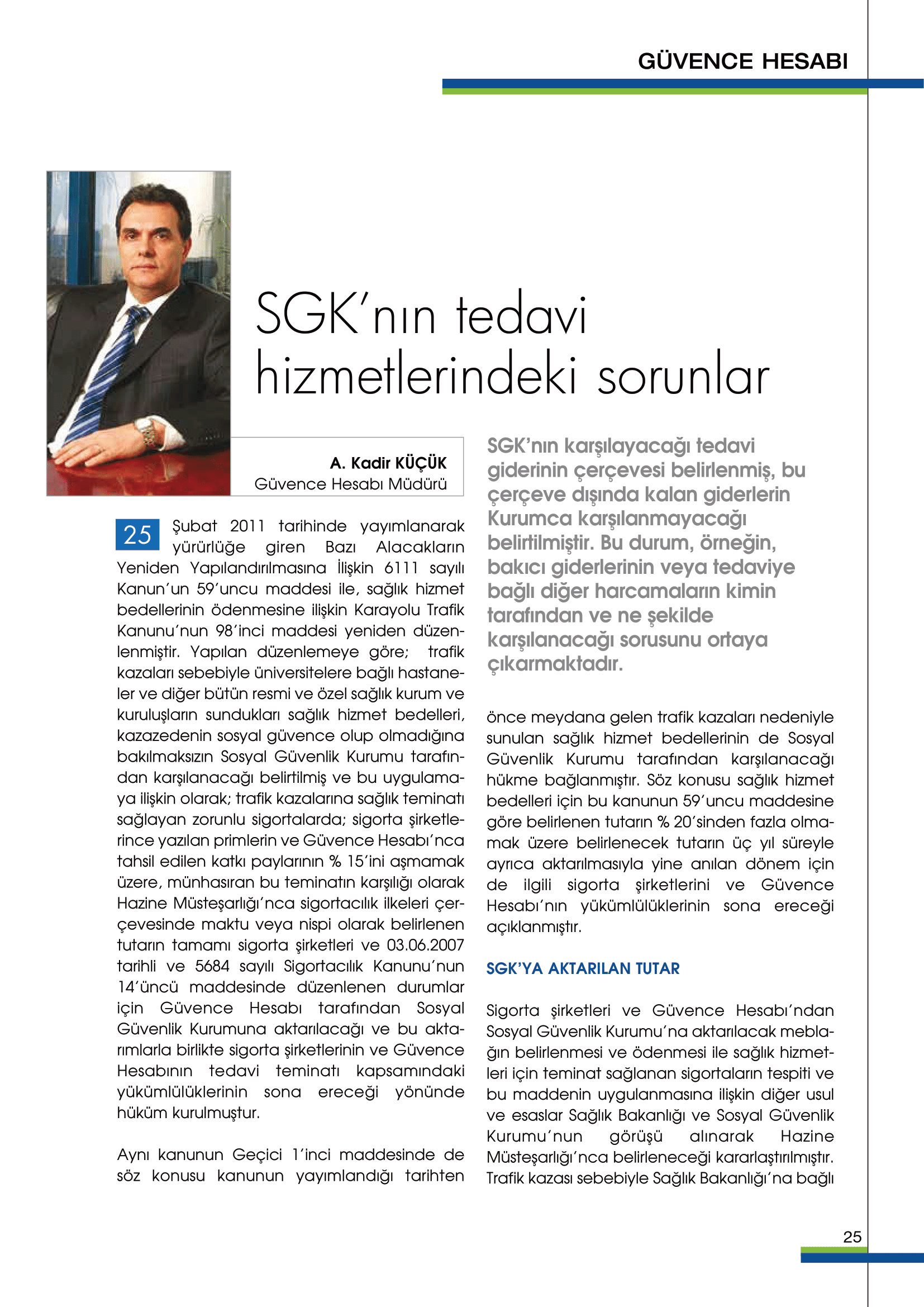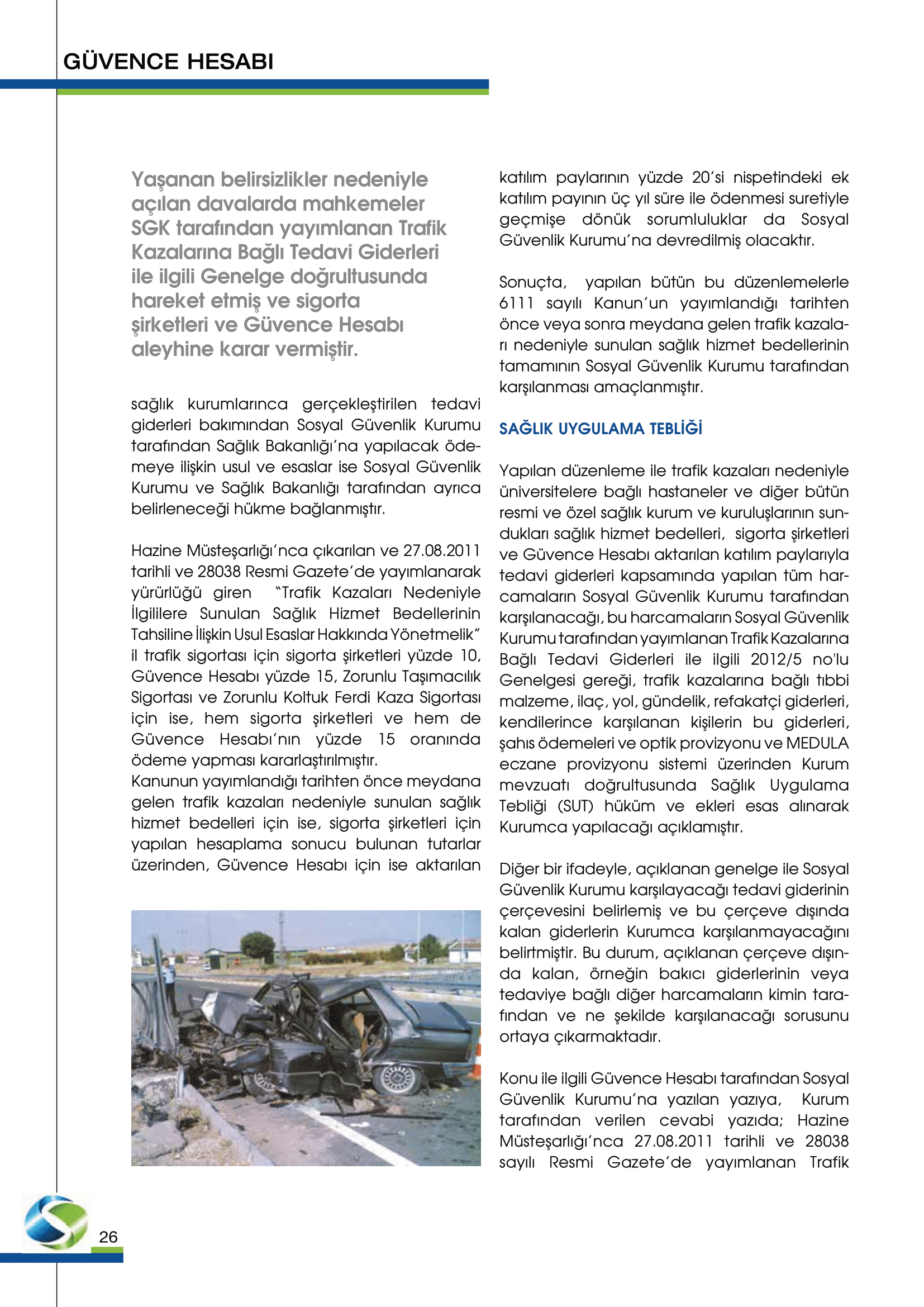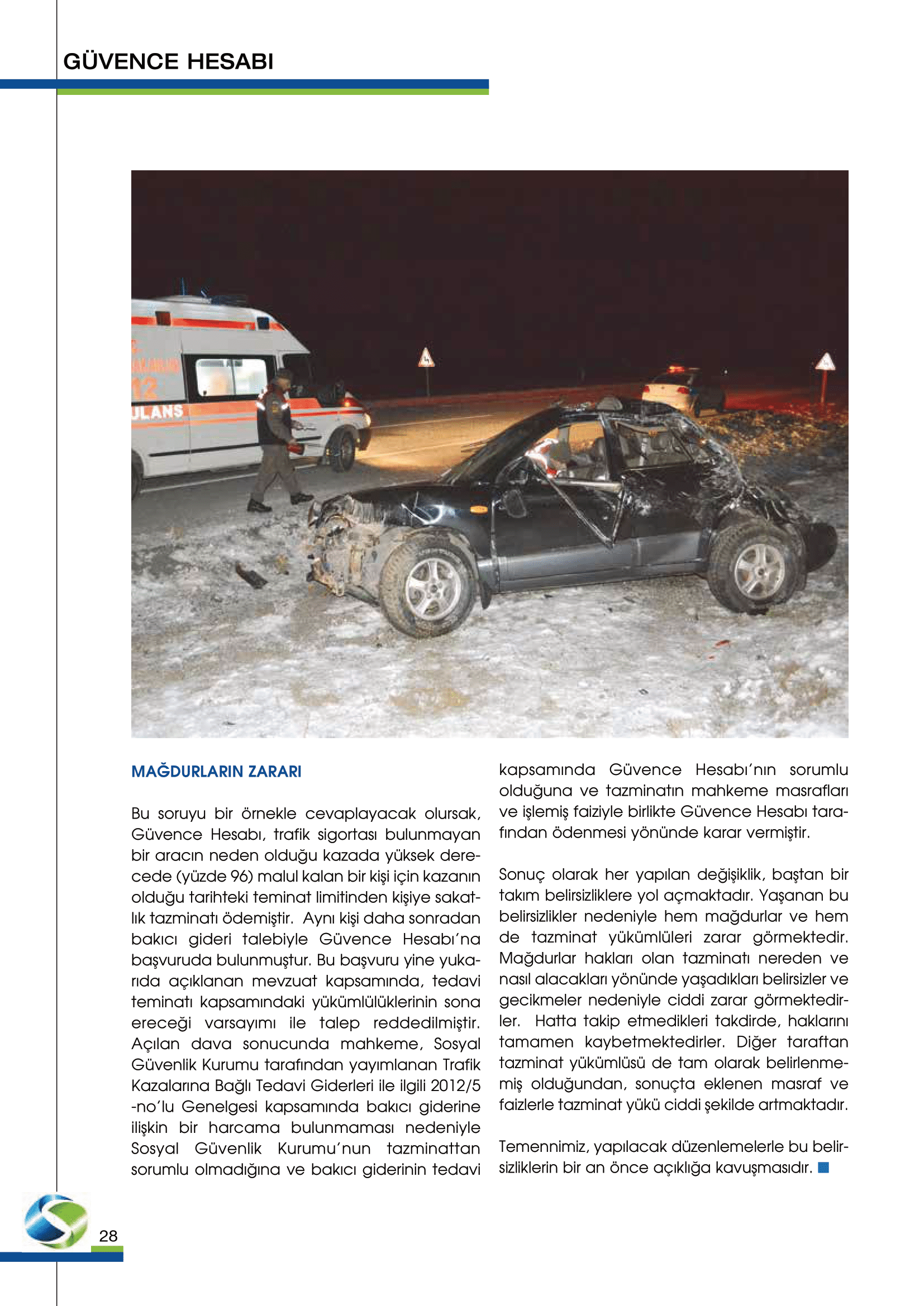 Güvence Hesabı, kapsamında bulunan zorunlu sigortaların sağladığı teminatlara ilişkin bedeni olarak (sakatlık ve ölüm) zarar görenlere kaza sonrasında sakat kalma halinde sakatlık tazminatı, ölüm halinde ise ölenin desteğinden yoksun kalanlara destekten yoksun kalma tazminatı ödemektedir.