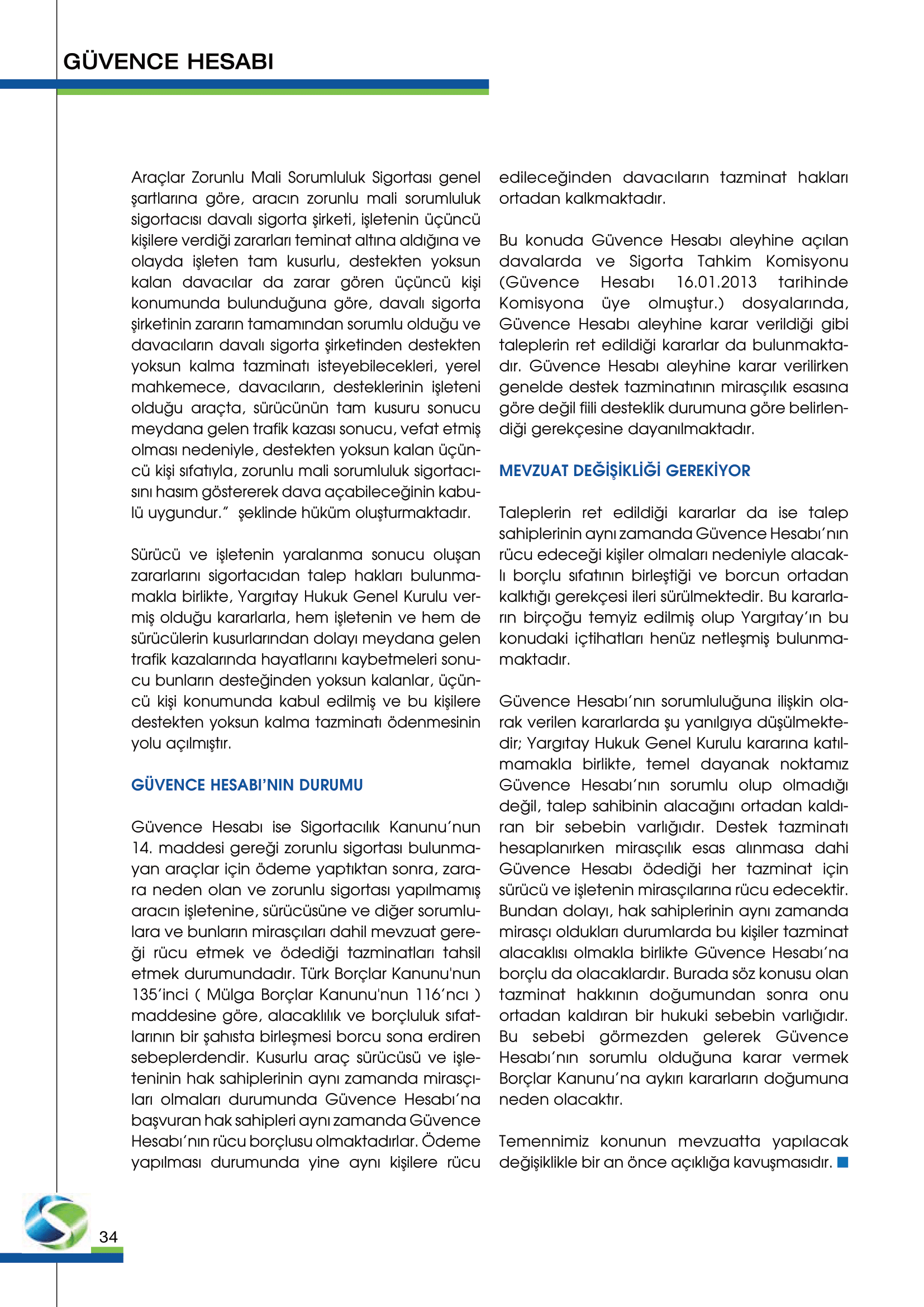Güvence Hesabı, kapsamında bulunan zorunlu sigortaların sağladığı teminatlara ilişkin bedeni olarak (sakatlık ve ölüm) zarar görenlere kaza sonrasında sakat kalma halinde sakatlık tazminatı, ölüm halinde ise ölenin desteğinden yoksun kalanlara destekten yoksun kalma tazminatı ödemektedir.