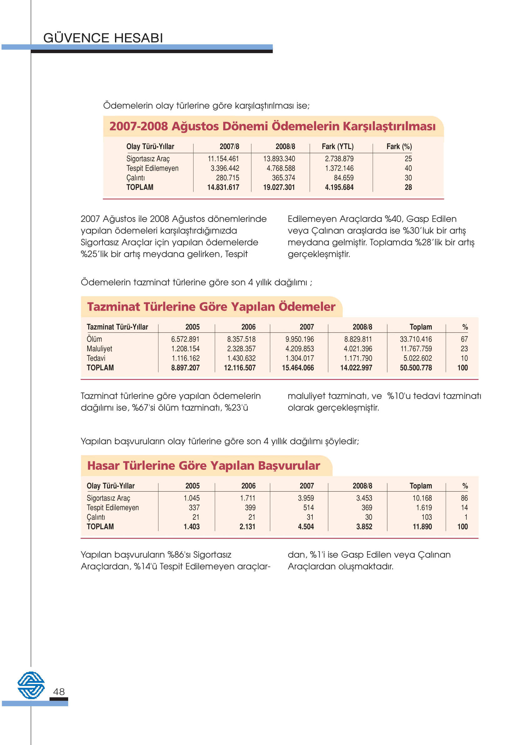 Güvence Hesabı, kapsamında bulunan zorunlu sigortaların sağladığı teminatlara ilişkin bedeni olarak (sakatlık ve ölüm) zarar görenlere kaza sonrasında sakat kalma halinde sakatlık tazminatı, ölüm halinde ise ölenin desteğinden yoksun kalanlara destekten yoksun kalma tazminatı ödemektedir.