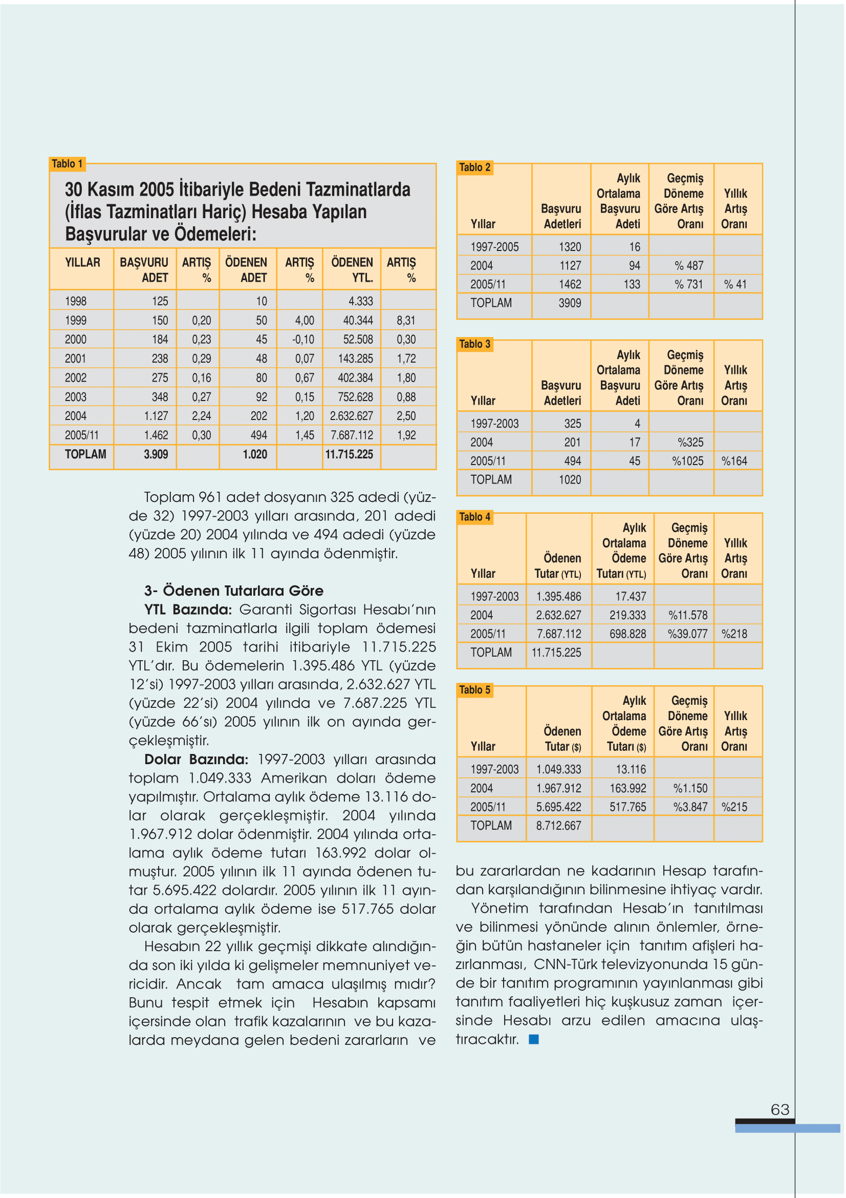 Güvence Hesabı, kapsamında bulunan zorunlu sigortaların sağladığı teminatlara ilişkin bedeni olarak (sakatlık ve ölüm) zarar görenlere kaza sonrasında sakat kalma halinde sakatlık tazminatı, ölüm halinde ise ölenin desteğinden yoksun kalanlara destekten yoksun kalma tazminatı ödemektedir.